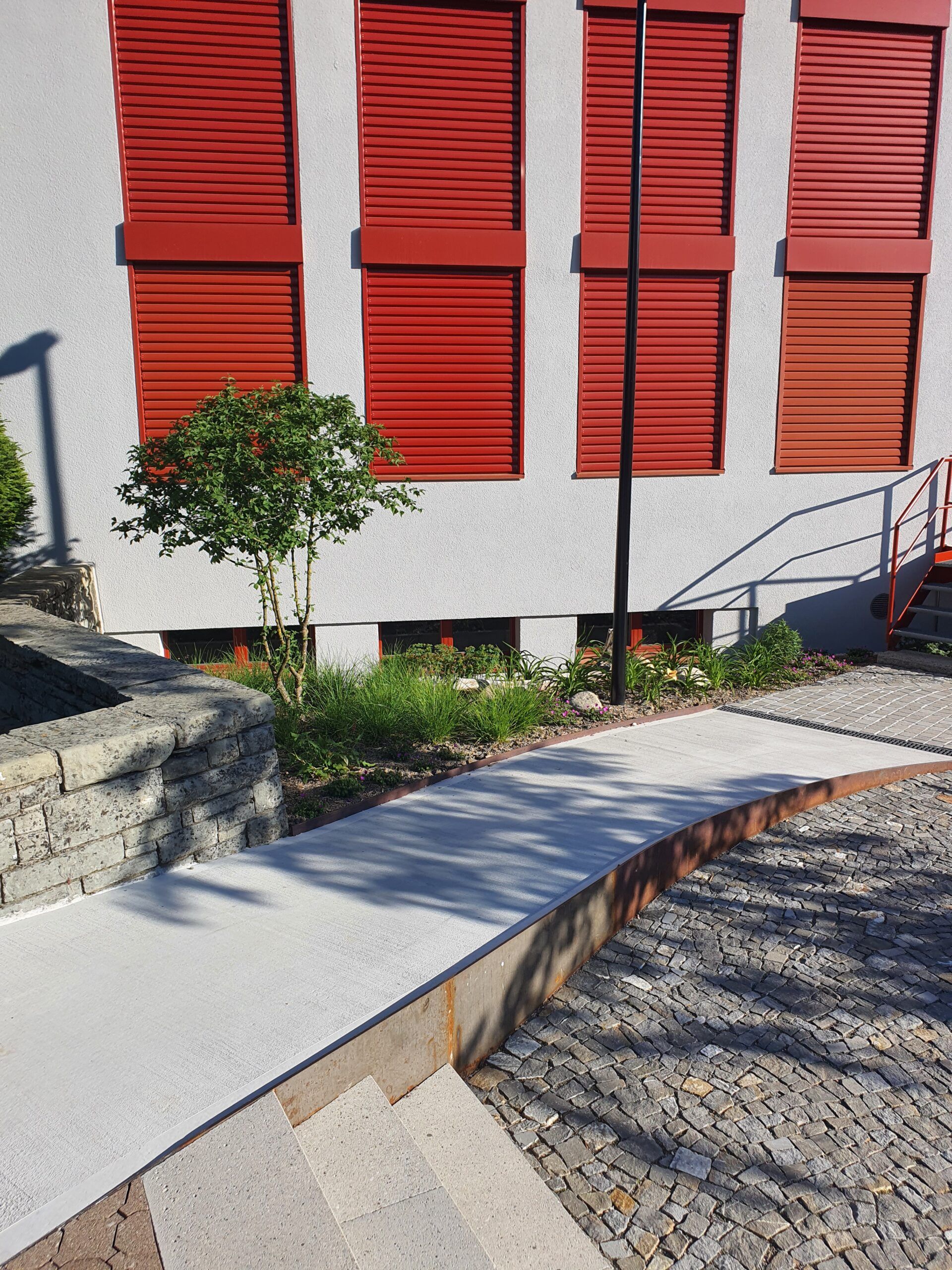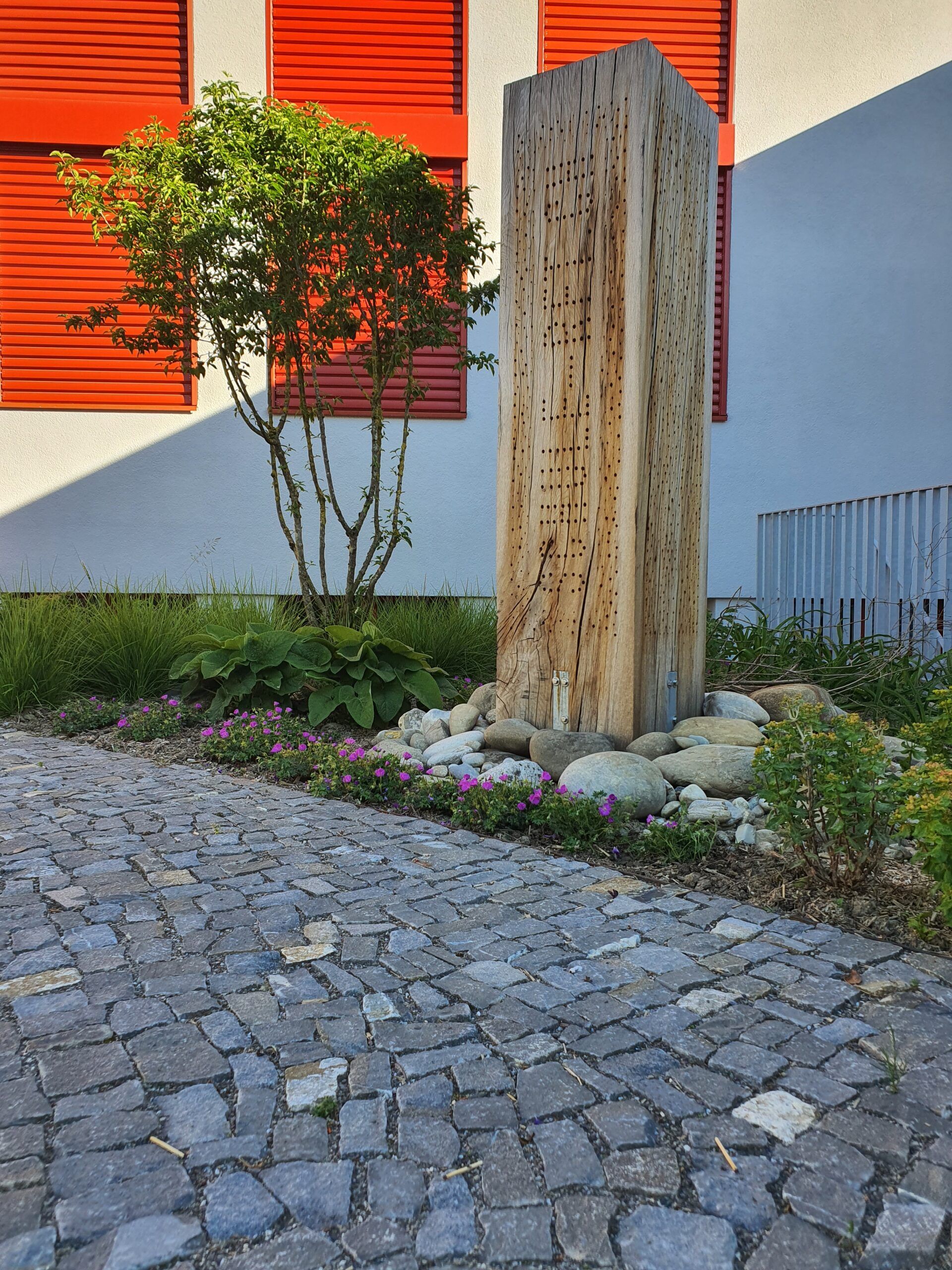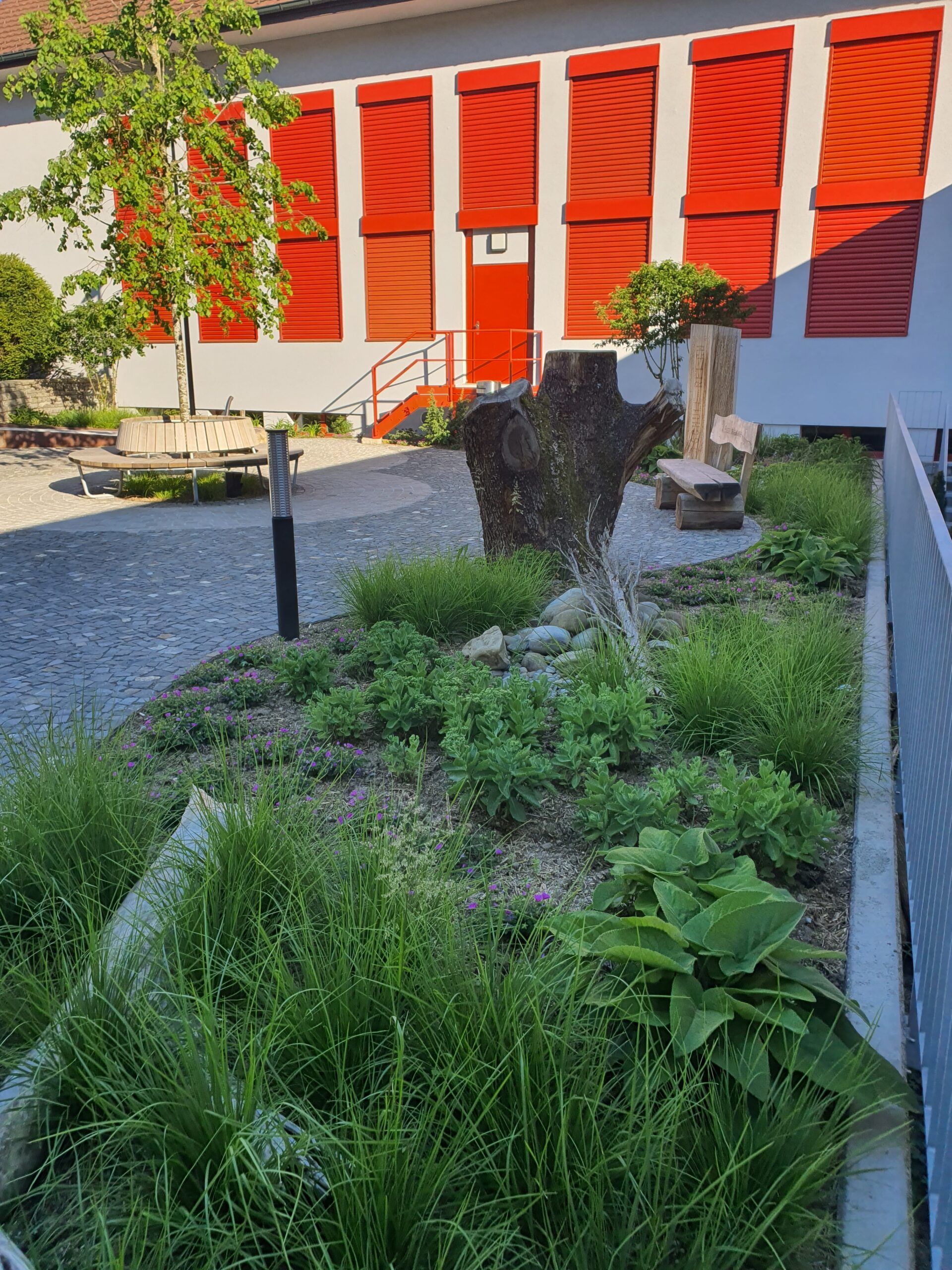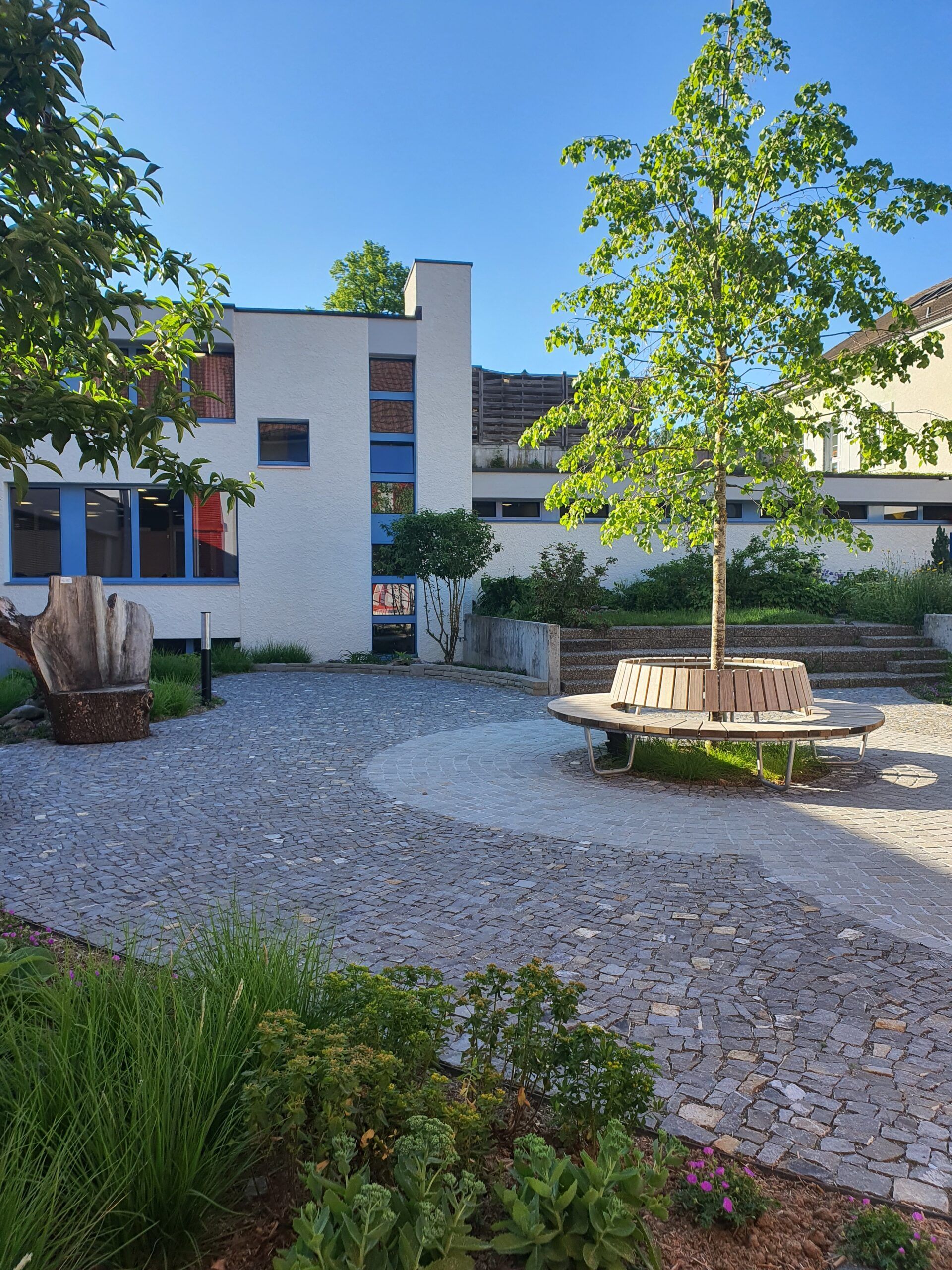 Die Fläche zwischen Gemeindehaus und Schulhaus, einst ein Schulgarten, war völlig verwildert. Wir erarbeiteten ein Projekt, das alle Altersgruppen zum Verweilen einladen soll. Auf dem nun öffentlichen Platz kann man sich im Schatten der Linde gemütlich erholen oder die Mittagspause im Freien verbringen oder mit Schulklassen den Unterricht nach draussen verlagern. Ein Trinkbrunnen und die vielfältige Staudenbepflanzung lassen den Platz sehr lebendig wirken. Eine behindertengerechte Rampe, die zum Zentrum des Platzes führt, erlaubt allen ungehinderten Zugang. Die Beläge sind mit Kopfsteinpflaster aus der Schweiz gepflastert.